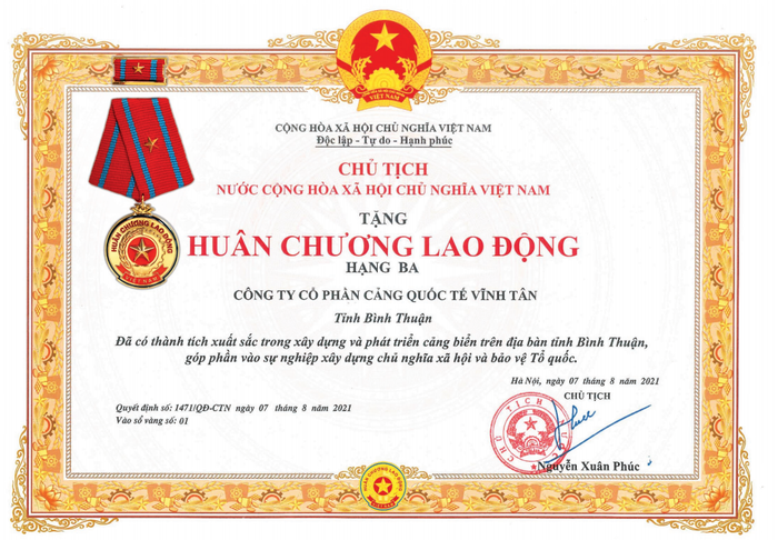 With contributions to the construction and development of seaports in Binh Thuan province, contributing to the cause of building socialism and defending the Fatherland, Vinh Tan International Port Joint Stock Company ( member of Pacific Group) was honored to be awarded the Labor Order, 3rd class by the President of the Socialist Republic of Vietnam.